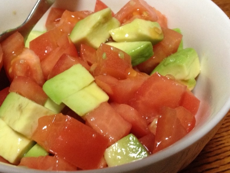 トマトとアボカドをサイコロに切って、塩であえるだけです。